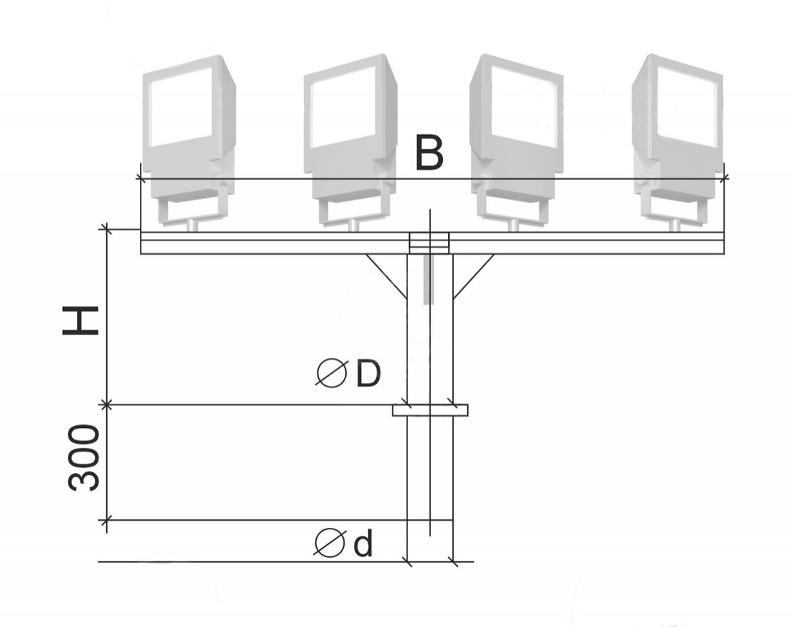 Вертикальная часть прожекторных т-образных кронштейнов служит для фиксации на верхней части ствола опоры или мачты освещения. B классическом исполнении она имеет хвостовик, длина которого по умолчанию составляет 300 мм. Для крепления прожекторного кронштейна используются метизы, которые вставляются в отверстия на оголовке. На горизонтальные части прожекторных кронштейнов крепятся осветительные приборы c монтажными скобами. Благодаря им можно направлять световой поток на необходимую точку освещаемой площадки.
